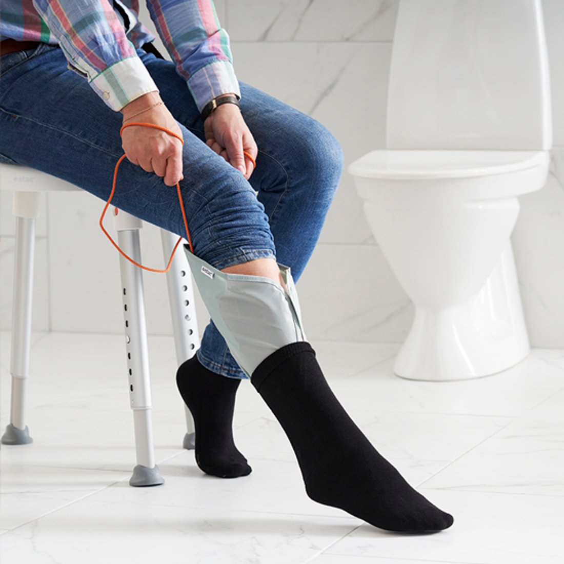 Instrucciones de uso de Etac Socky Short: El calcetín se coloca sobre la tela del Socky hasta que la parte superior del calcetín quede sobre los ganchos. Luego, se coloca la cuerda detrás de la pantorrilla y se tira hacia arriba. Socky Short se desliza fácilmente alrededor del pie y la pierna, colocando los calcetines de manera precisa y sin esfuerzo.